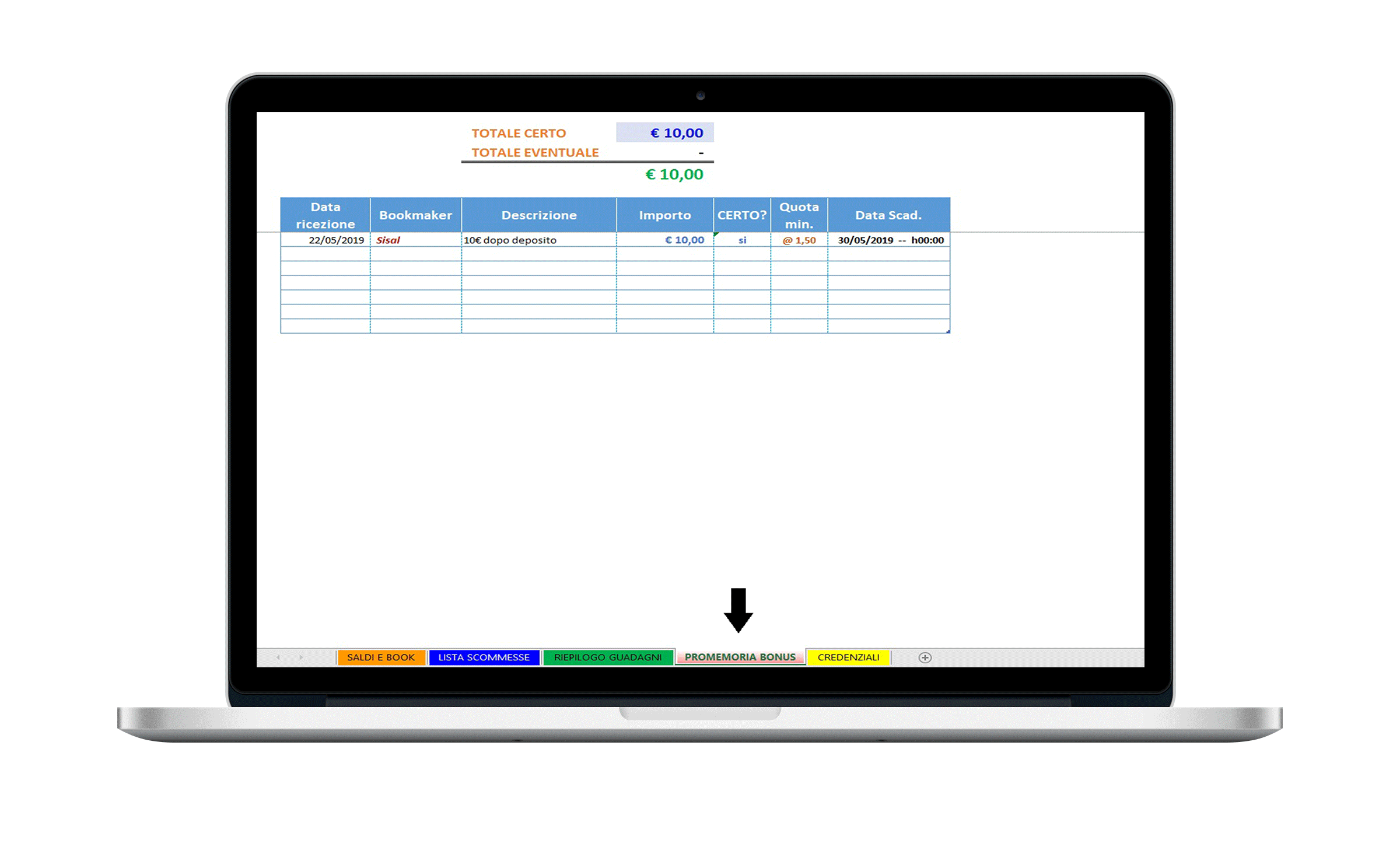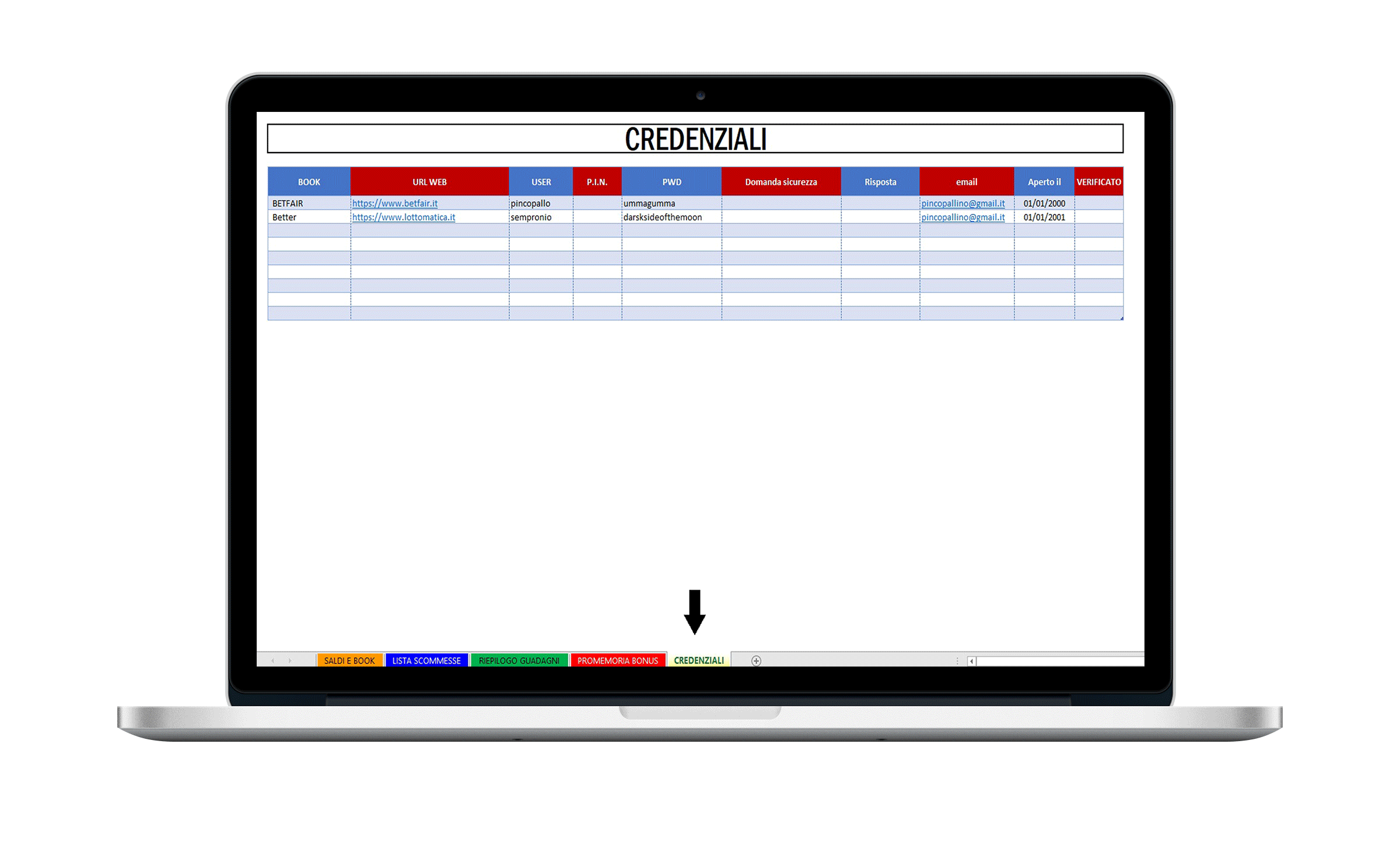 In questo foglio potrai annotare le tue credenziali che ti permetteranno di accedere ai bookmakers ai quali ti sei registrato. Gli esperti di sicurezza informatica consigliano infatti di non memorizzare sul browser le password per l’accesso ai siti web.