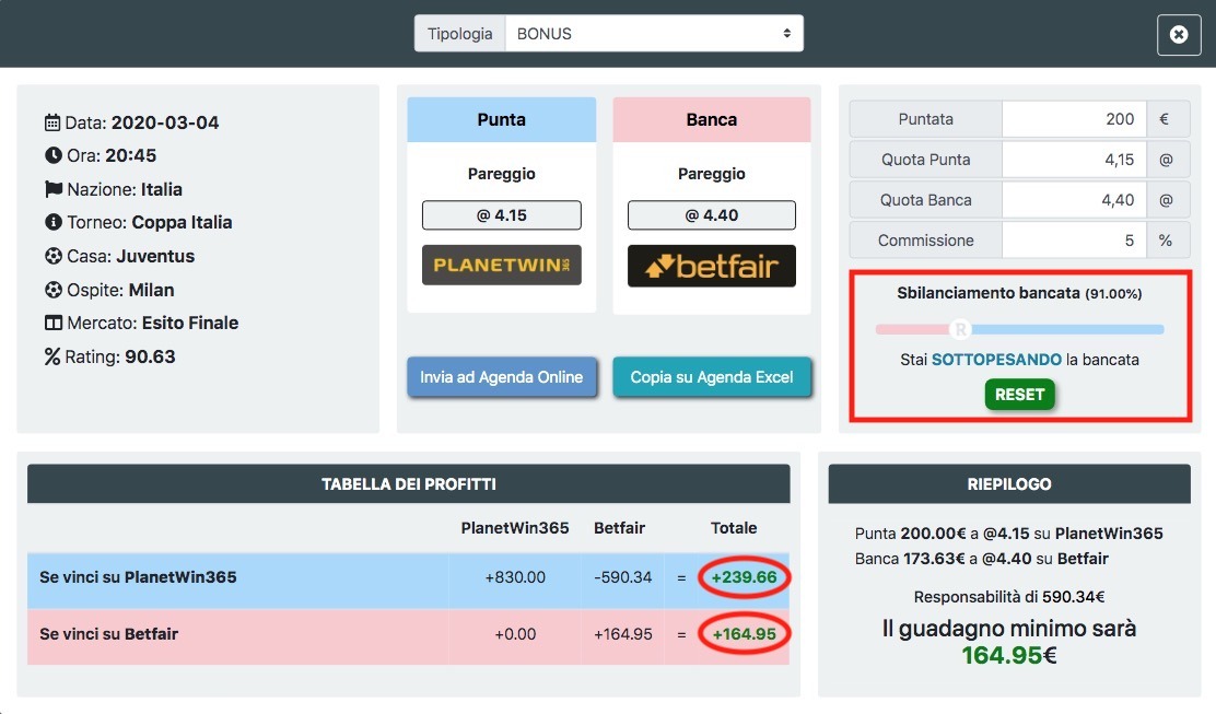 Questo bonus ha rollover 8x, dovrai quindi cercare di perderlo subito in modo da minimizzare le perdite dovute al rigioco che avrai entrando nel rollover. Per minimizzare questo rischio potrai sbilanciare la bancata sottopesandola all’interno del calcolatore. Vedremo tra poco cosa significa e cosa implica.